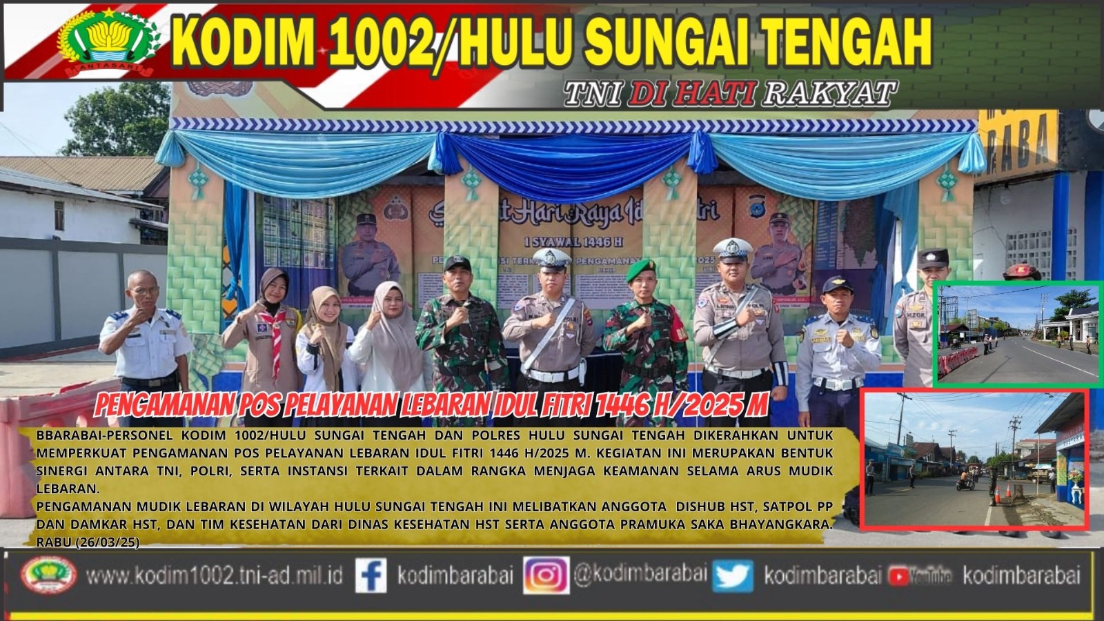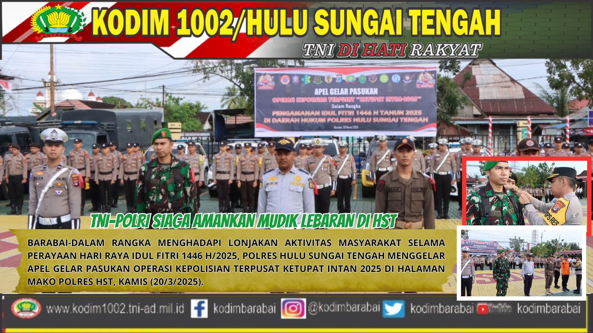 BARABAI,Guna memastikan keamanan dan kelancaran arus mudik Lebaran Idul Fitri 1446 H/2025 M, personel Kodim 1002/Hulu Sungai Tengah (HST) dan Polres HST bersinergi dengan