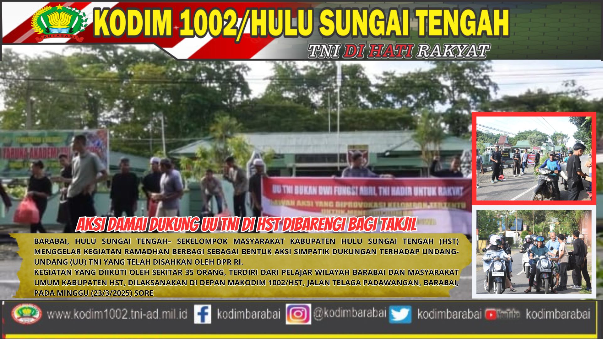 Barabai, Hulu Sungai Tengah– Sekelompok masyarakat Kabupaten Hulu Sungai Tengah (HST) menggelar kegiatan Ramadhan berbagi sebagai bentuk aksi simpatik dukungan terhadap Undang-Undang (UU) TNI