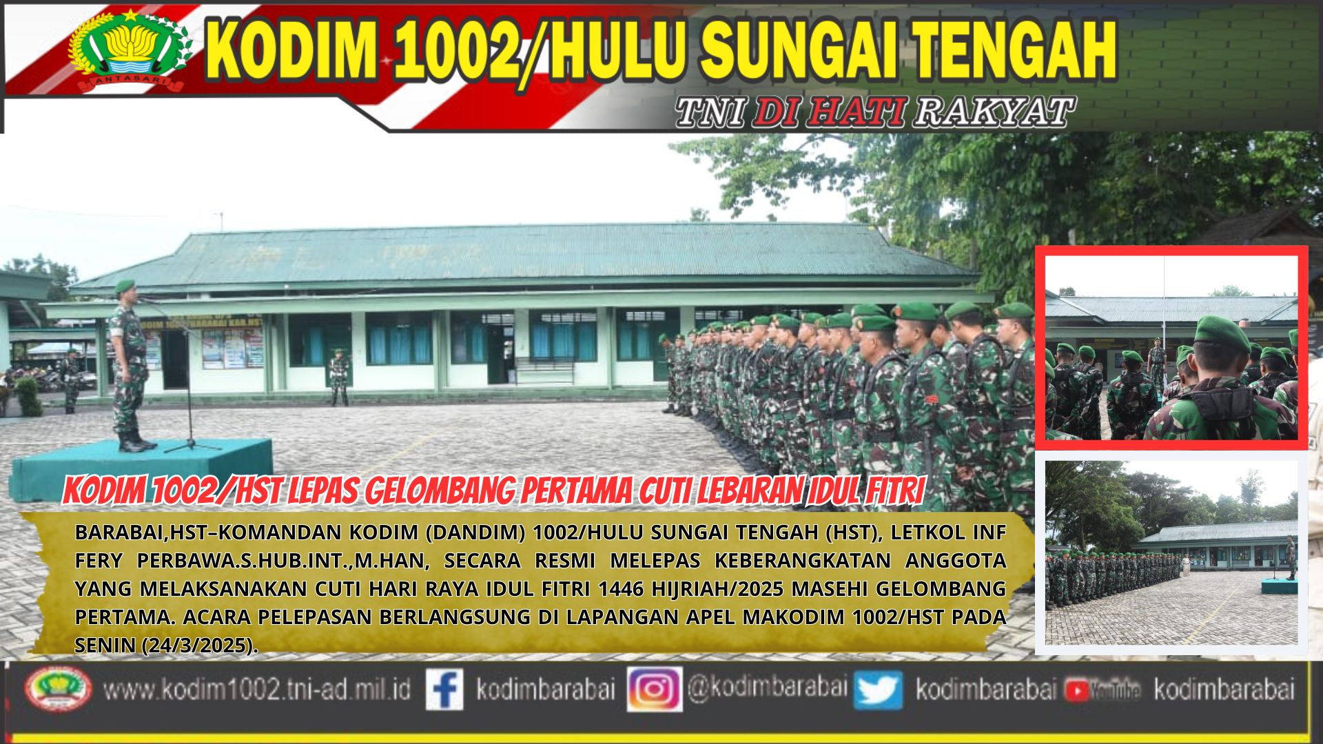 BARABAI,HST–Komandan Kodim (Dandim) 1002/Hulu Sungai Tengah (HST), Letkol Inf Fery Perbawa.S.Hub.Int.,M.Han, secara resmi melepas keberangkatan anggota yang melaksanakan cuti Hari Raya Idul Fitri 1446