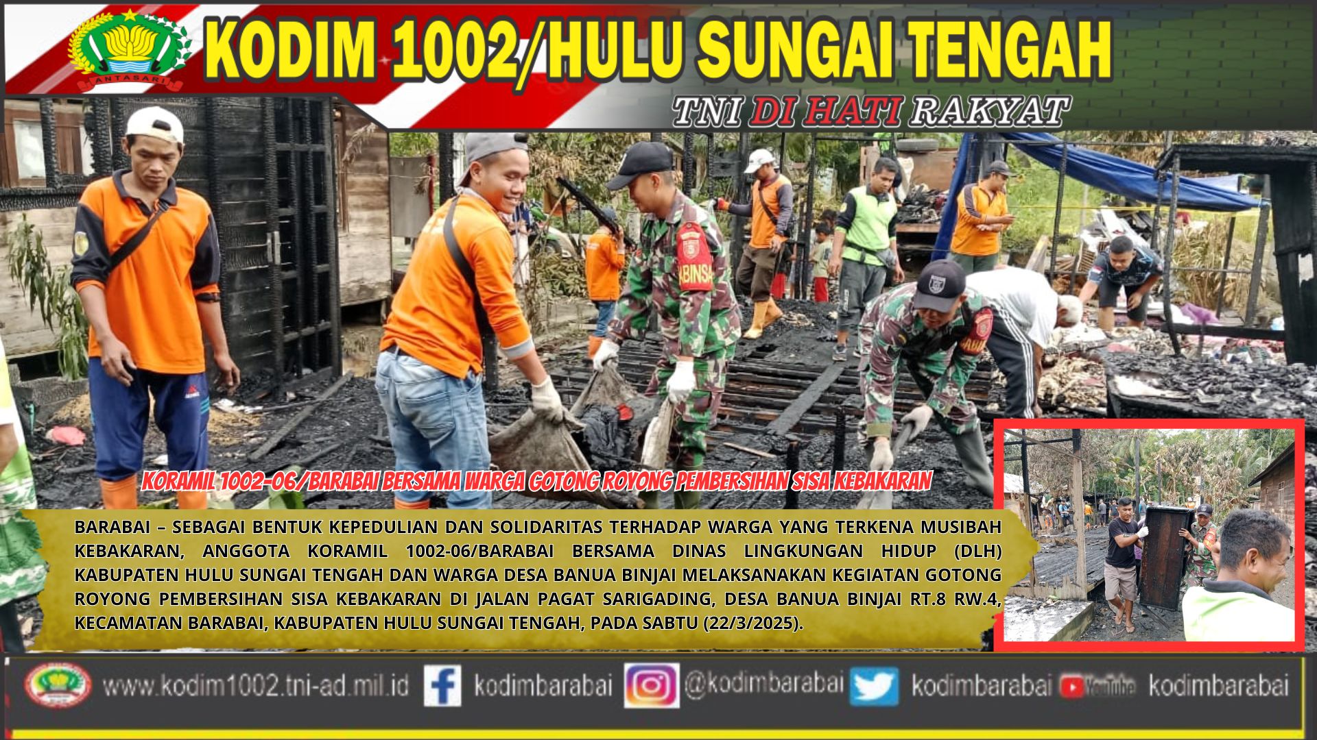 Barabai, Hulu Sungai Tengah – Sebagai bentuk kepedulian dan solidaritas terhadap warga yang terkena musibah kebakaran, anggota Koramil 1002-06/Barabai bersama Dinas Lingkungan Hidup (DLH)