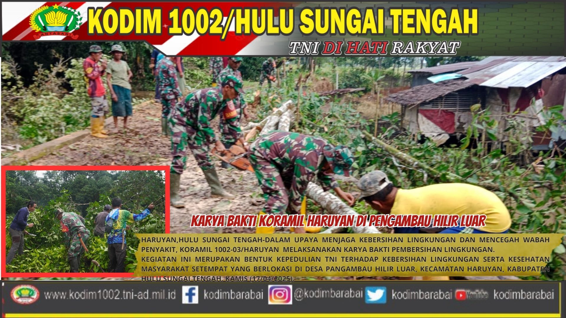 HARUYAN,HULU SUNGAI TENGAH-Dalam upaya menjaga kebersihan lingkungan dan mencegah wabah penyakit, Koramil 1002-03/Haruyan melaksanakan karya bakti pembersihan lingkungan. Kegiatan ini merupakan bentuk kepedulian TNI
