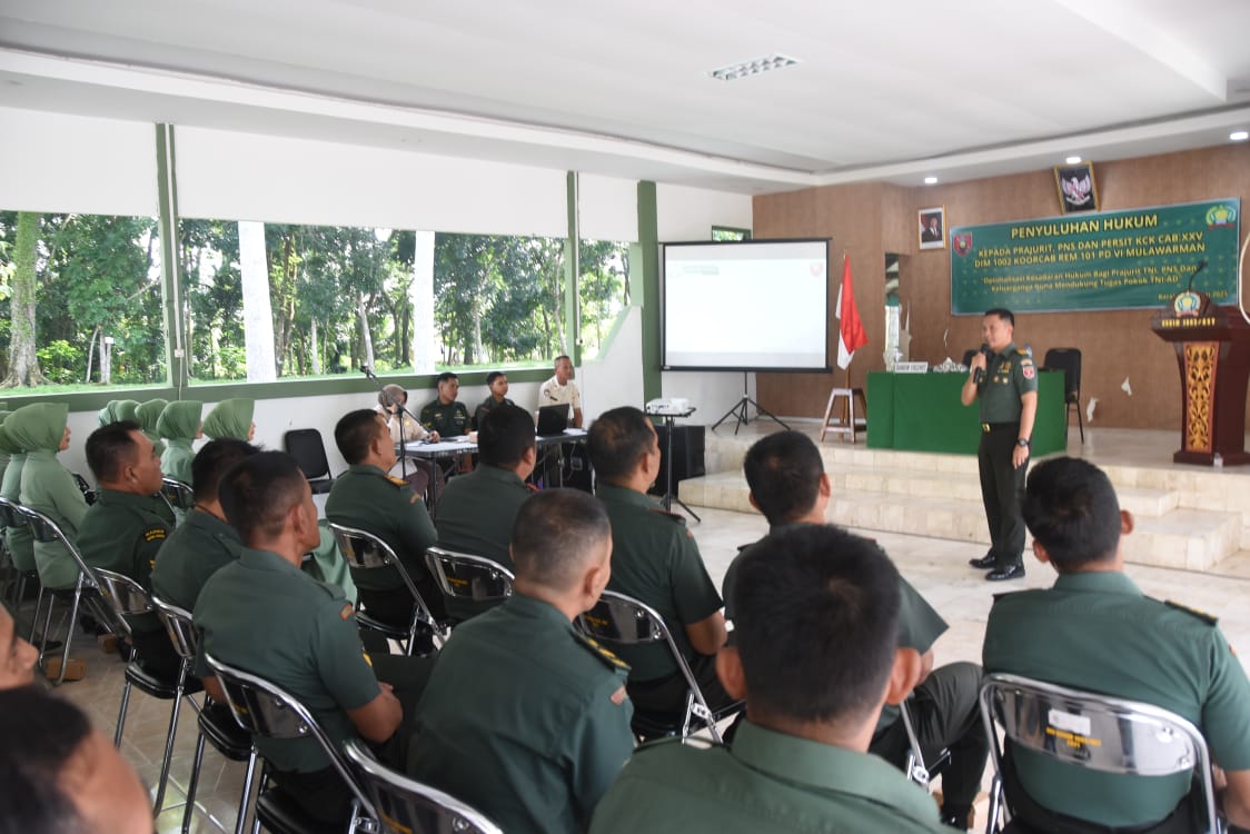BARABAI, HULU SUNGAI TENGAH– Prajurit dan Persit Komando Distrik Militer (Kodim) 1002/Hulu Sungai Tengah (HST) mengikuti penyuluhan hukum dari Komando Daerah Militer (Kumdam) VI/Mulawarman.