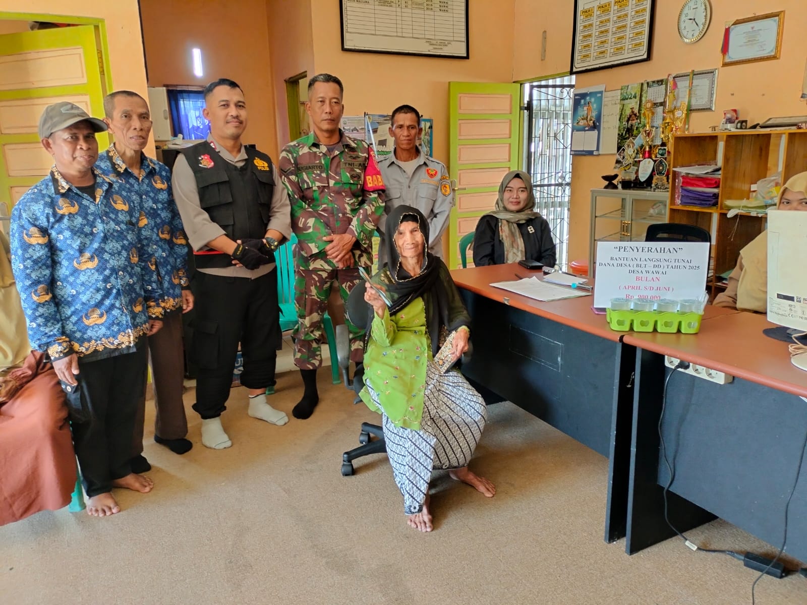 BARABAI,Sertu Sugiarto, seorang Babinsa dari Koramil 1002-01/Batang Alai Selatan, bersama Bhabinkamtibmas Polsek Batang Alai Selatan, bersinergi mendampingi proses penyaluran Bantuan Langsung Tunai (BLT) di