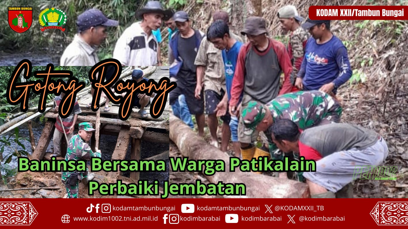HULU SUNGAI TENGAH – Babinsa Koramil 1002-07/Batu Benawa, Sertu Sanu, bersama warga Desa Patikalain RT 05 melaksanakan gotong royong perbaikan jembatan yang rusak akibat