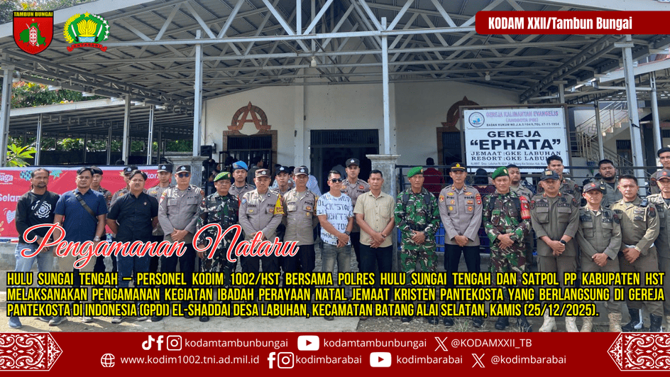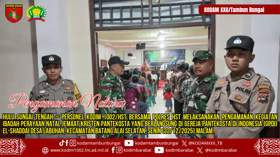 HULU SUNGAI TENGAH – Personel Kodim 1002/HST bersama Polres Hulu Sungai Tengah dan Satpol PP Kabupaten HST melaksanakan pengamanan kegiatan Ibadah Perayaan Natal Jemaat