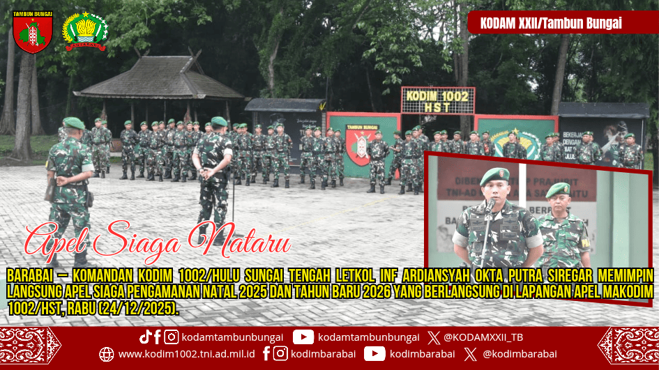 BARABAI – Komandan Kodim 1002/Hulu Sungai Tengah Letkol Inf Ardiansyah Okta Putra Siregar memimpin langsung apel siaga pengamanan Natal 2025 dan Tahun Baru 2026