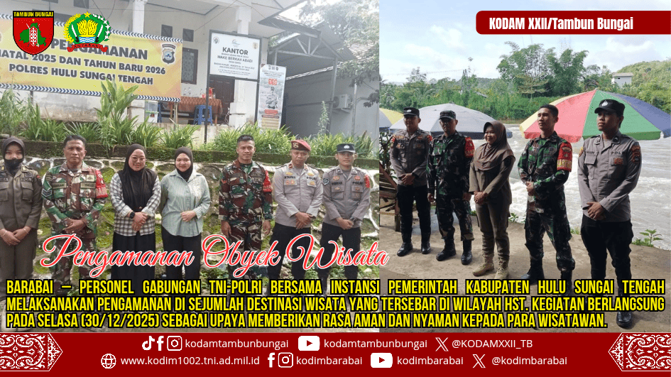 BARABAI – Personel gabungan TNI-Polri bersama instansi pemerintah Kabupaten Hulu Sungai Tengah melaksanakan pengamanan di sejumlah destinasi wisata yang tersebar di wilayah HST. Kegiatan