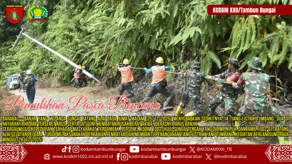 BARABAI – Banjir yang melanda Sungai Batang Alai pada Jumat malam (25/12/2025) menyebabkan sedikitnya 14 tiang listrik tumbang, dua di antaranya hilang terseret arus,