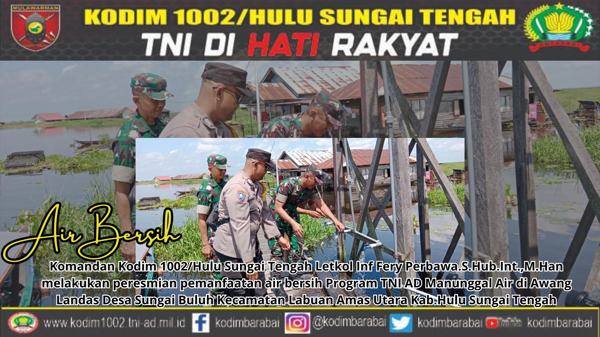 BARABAI-Komandan Kodim 1002/Hulu Sungai Tengah Letkol Inf Fery Perbawa.S.Hub.Int.,M.Han melakukan peresmian pemanfaatan air bersih Program TNI AD Manunggal Air di Awang Landas Desa Sungai Buluh Kecamatan Labuan Amas Utara Kab.Hulu Sungai Tengah. Selasa (06/02).