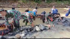 “Bahu membahu anggota TNI bersama BPBD HST, Relawan dan warga masyarakat desa Alat mengumpulkan batu untuk di isikan ke dalam bronjong besi sebagai tiang jembatan,