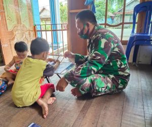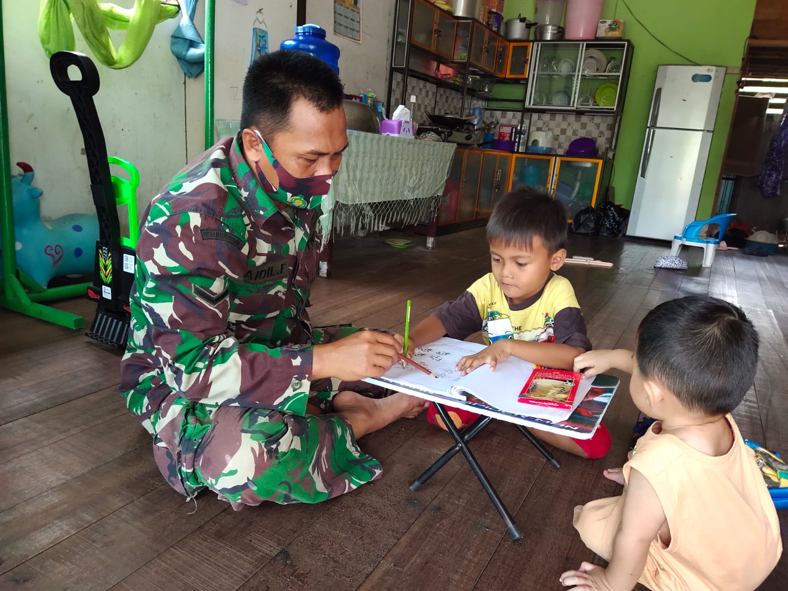 Dengan dasar inilah anggota Stagas TMMD ke-112 Kodim 1002/HST Sertu Rizky Ridwan dari Yonif 621/Manuntung membantu mengerjakan pekerjaan rumah (PR) adik Fahriansyah siswa kelas II SDN Desa Rantau Keminting. Senin (04/09/2021).