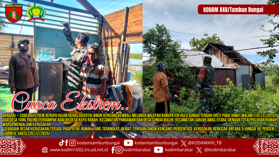 Sementara itu, Babinsa Koramil 1002-08/Labuan Amas Utara, Sertu Aspiani, melaporkan bahwa 40 unit rumah warga dan 2 unit warung mengalami kerusakan dengan tingkat keparahan 5 hingga 80 persen.