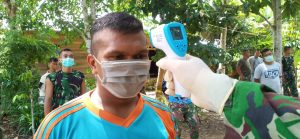 BARABAI – Dalam rangka deteksi dini penyebaran Covid-19, anggota Satgas TMMD ke-107 tahun 2020 Kodim 1002/Barabai melaksanakan pemeriksaan Thermal Scanner (pemeriksaan suhu badan/tubuh), Kamis (9/4).