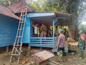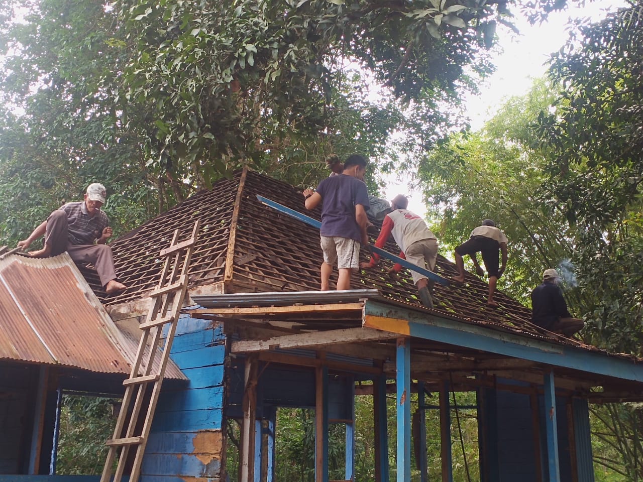 Bahu membahu anggota Kodim 1002/HST dan warga sekitar musholla Noor Iman membongkar mulai dari atap, dinding musholla dengan penuh semangat.Selasa (07/00/2021).