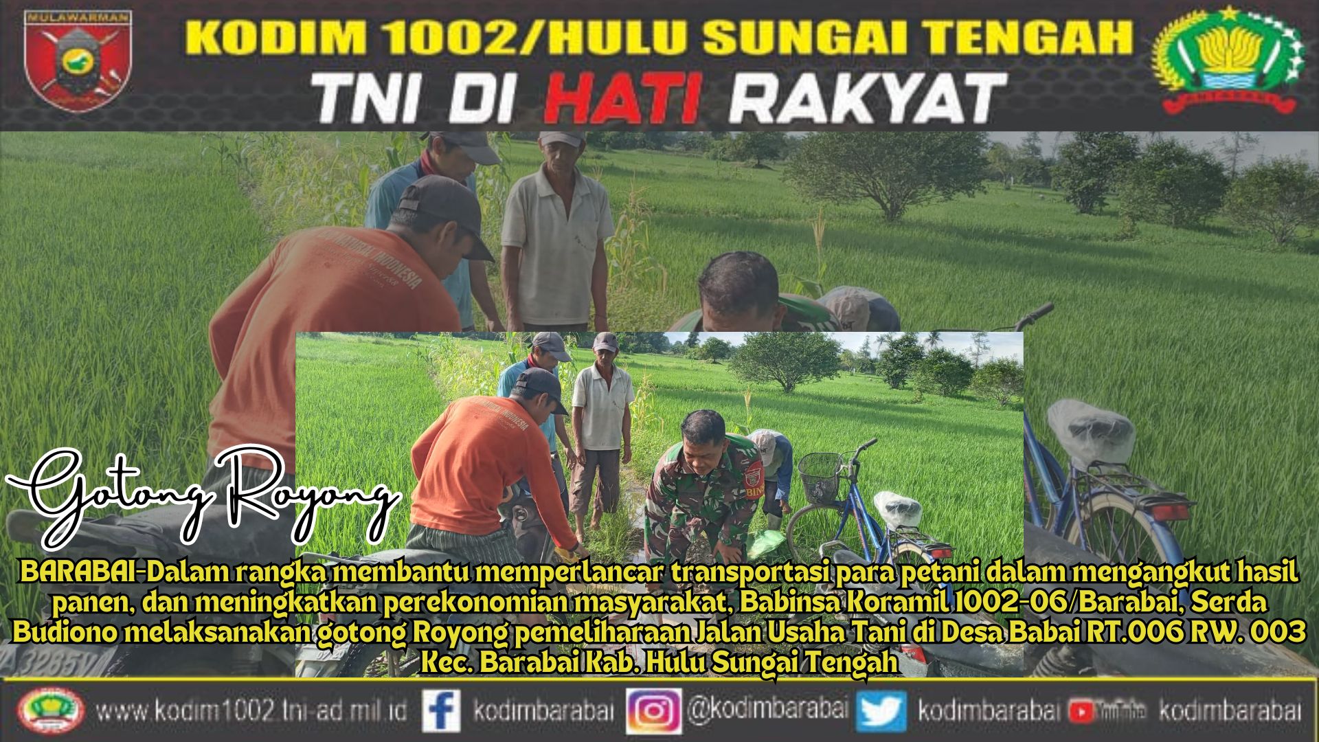 BARABAI-Dalam rangka membantu memperlancar transportasi para petani dalam mengangkut hasil panen, dan meningkatkan perekonomian masyarakat, Babinsa Koramil 1002-06/Barabai, Serda Budiono melaksanakan gotong Royong pemeliharaan Jalan Usaha Tani di Desa Babai RT.006 RW. 003 Kec. Barabai Kab. Hulu Sungai Tengah.Rabu (07/02).
