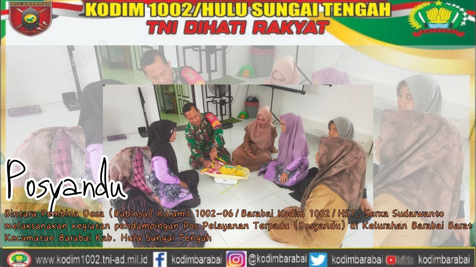 BARABAI-Bintara Pembina Desa (Babinsa) Koramil 1002-06/Barabai Kodim 1002/HST, Serka Sudarwanto melaksanakan kegiatan pendampingan Pos Pelayanan Terpadu (Posyandu) di Kelurahan Barabai Barat Kecamatan Barabai Kab. Hulu Sungai Tengah. Selasa (23/01).