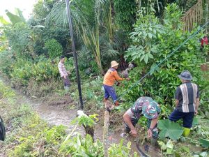 BARABAI-Babinsa Koramil 1002-06/Barabai Koptu Samsu Hadi bersama Bhabinkamtibmas dan aparat desa serta warga melaksanakan gotong royong pembersihan saluran air/drainase di desa Ayuang Kecamatan Barabai Kabupaten Hulu Sungai Tengah (HST) Kalimantan Selatan. Selasa (18/10).