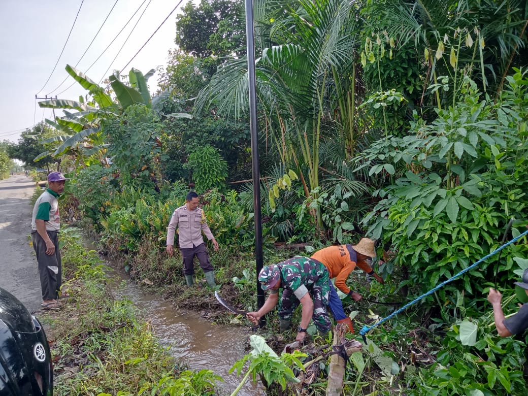 Terlihat begitu kompak Babinsa, Bhabinkamtibmas dan warga bahu-membahu gotong royong membersihkan saluran air,