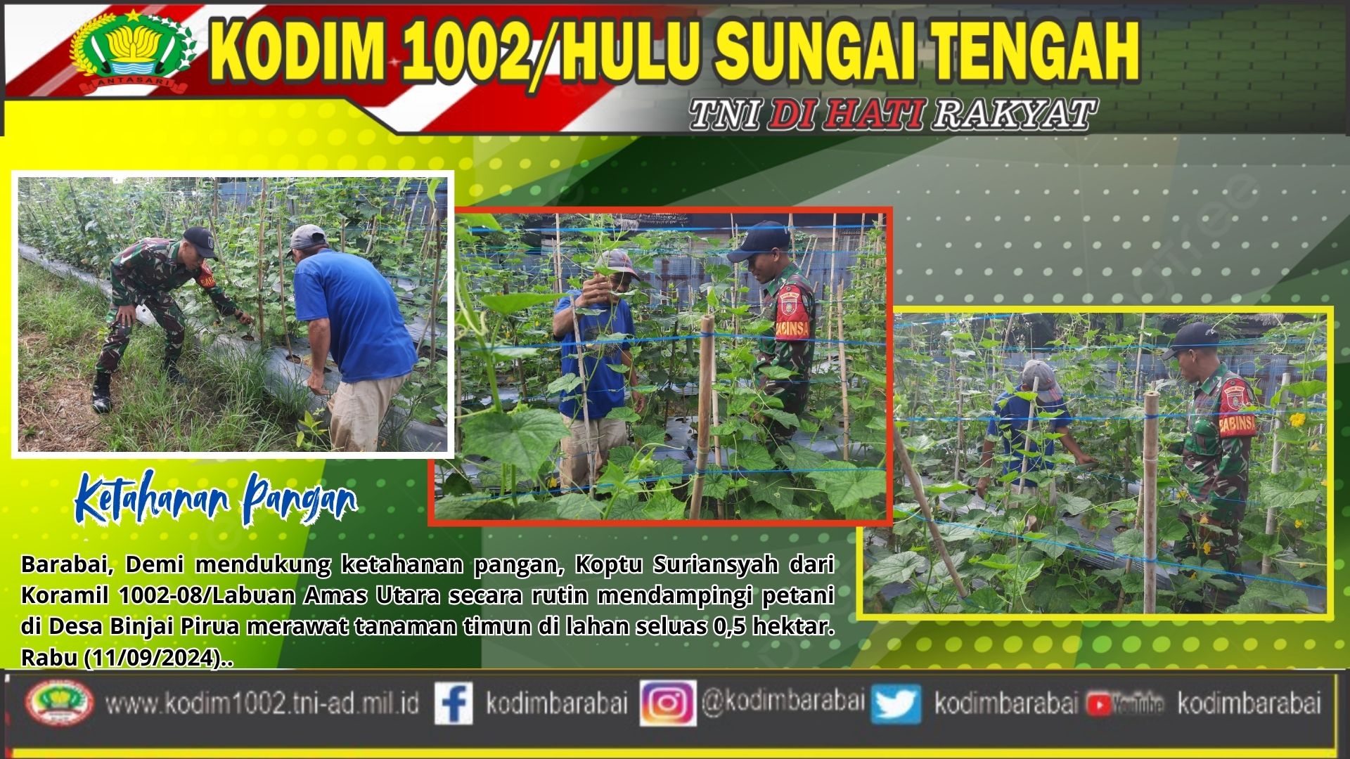 Barabai, Demi mendukung ketahanan pangan, Koptu Suriansyah dari Koramil 1002-08/Labuan Amas Utara secara rutin mendampingi petani di Desa Binjai Pirua merawat tanaman timun di lahan seluas 0,5 hektar. Rabu (11/09/2024).