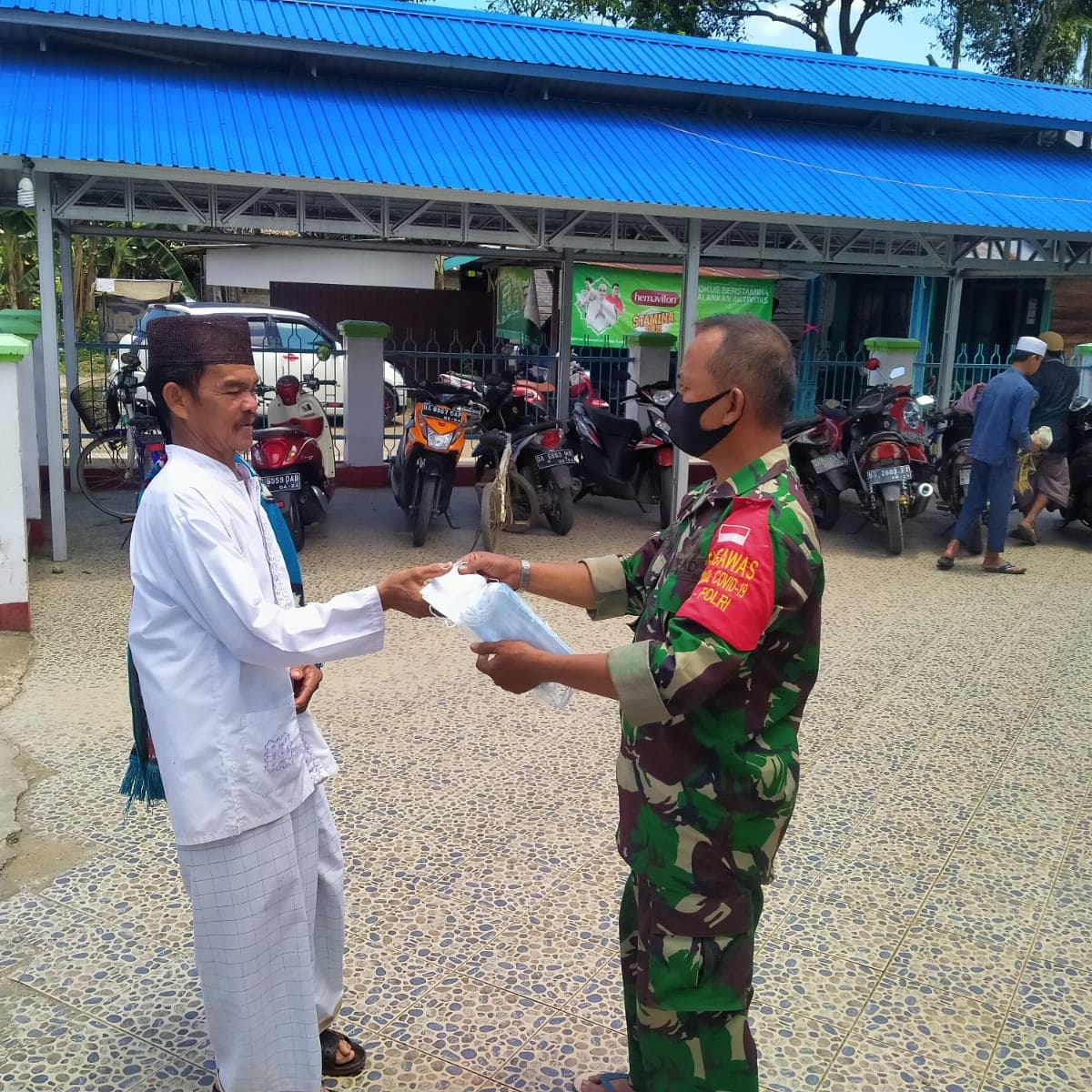 Protokol kesehatan dilakukan di masjid Nurul, Yakin desa Ramtau Keminting dengan melakukan himbauan dan membagikam masker gratis kepada jamaah sholat Jum’at.