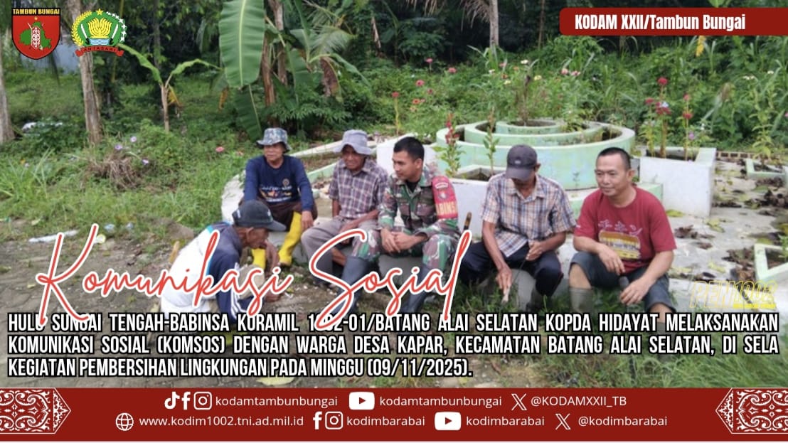 HULU SUNGAI TENGAH Babinsa Koramil 1002-01/Batang Alai Selatan Kopda Hidayat melaksanakan komunikasi sosial (Komsos) dengan warga Desa Kapar, Kecamatan Batang Alai Selatan, di sela kegiatan pembersihan lingkungan pada Minggu (09/11/2025).