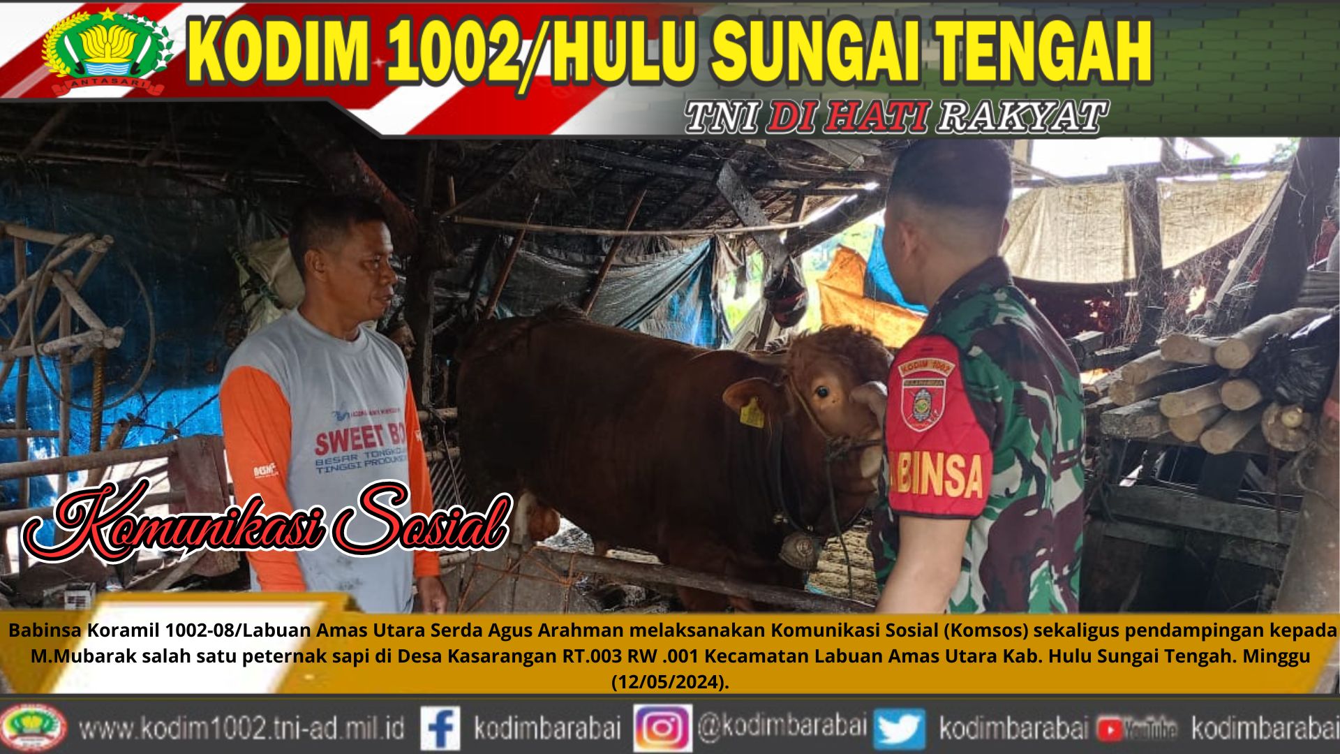Seperti yang dilakukan oleh Babinsa Koramil 1002-08/Labuan Amas Utara Serda Agus Arahman melaksanakan Komunikasi Sosial (Komsos) sekaligus pendampingan kepada M.Mubarak salah satu peternak sapi di Desa Kasarangan RT.003 RW .001 Kecamatan Labuan Amas Utara Kab. Hulu Sungai Tengah. Minggu (12/05/2024).