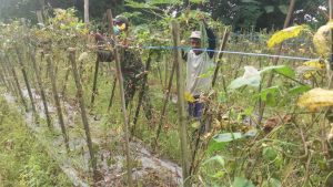 Sambil komsos Serda Dwi Suprap membantu bapak Hamrani memetik /panen dan melakukan perawatan tananam kacang panjang.