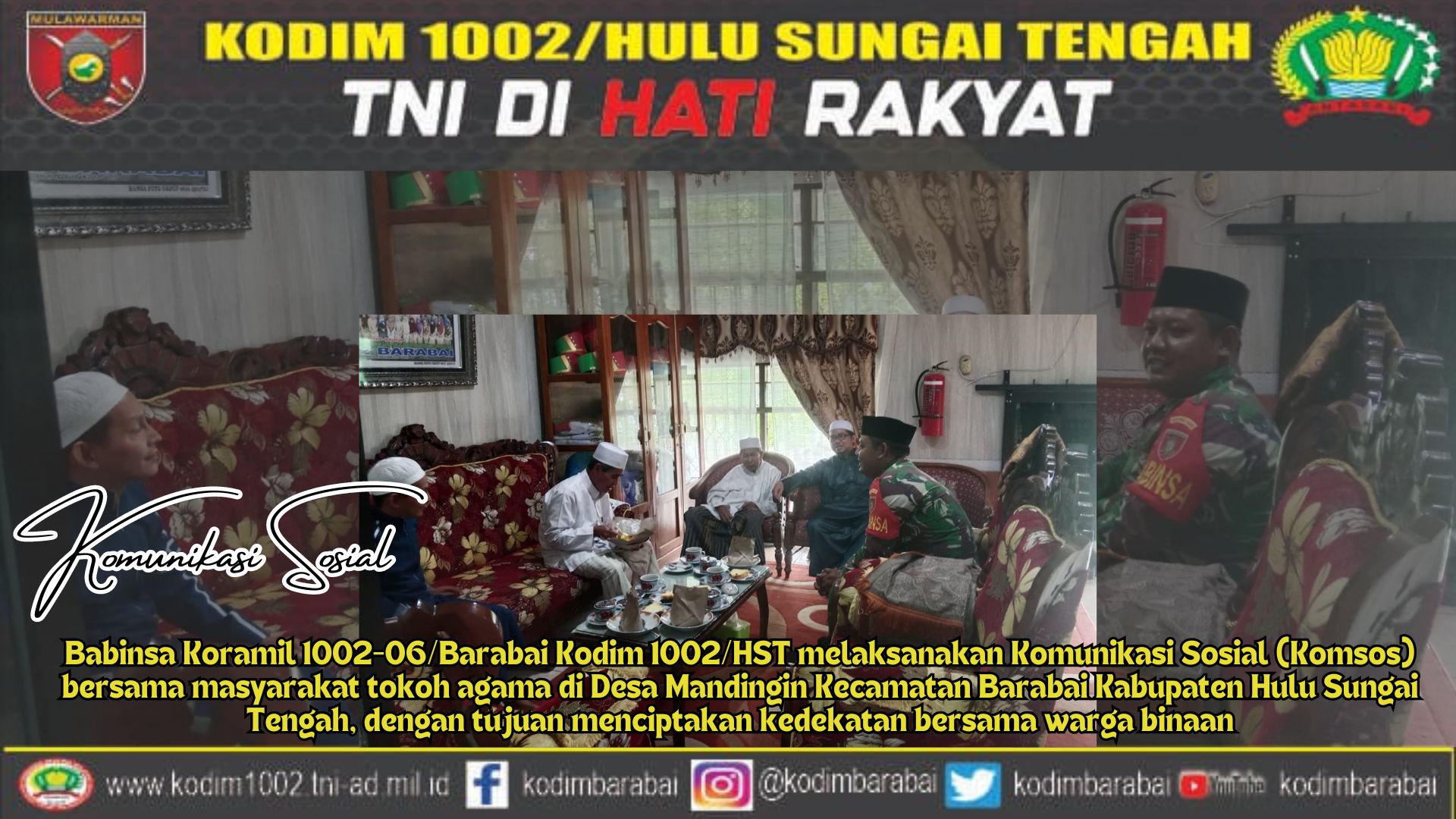 “Terpisah Danramil 1002-06/Barabai Kapten Inf Rudi Hartono mengatakan, Komsos (Komunikasi Sosial ini merupakan methode Binter (Pembinaan Teritorial) yang sangat efektif dilakukan Babinsa di Desa Binaan, karena dengan komsos ini, Babinsa dapat langsung berinteraksi dengan warga binaan dari berbagai latar belakang,”ujarnya