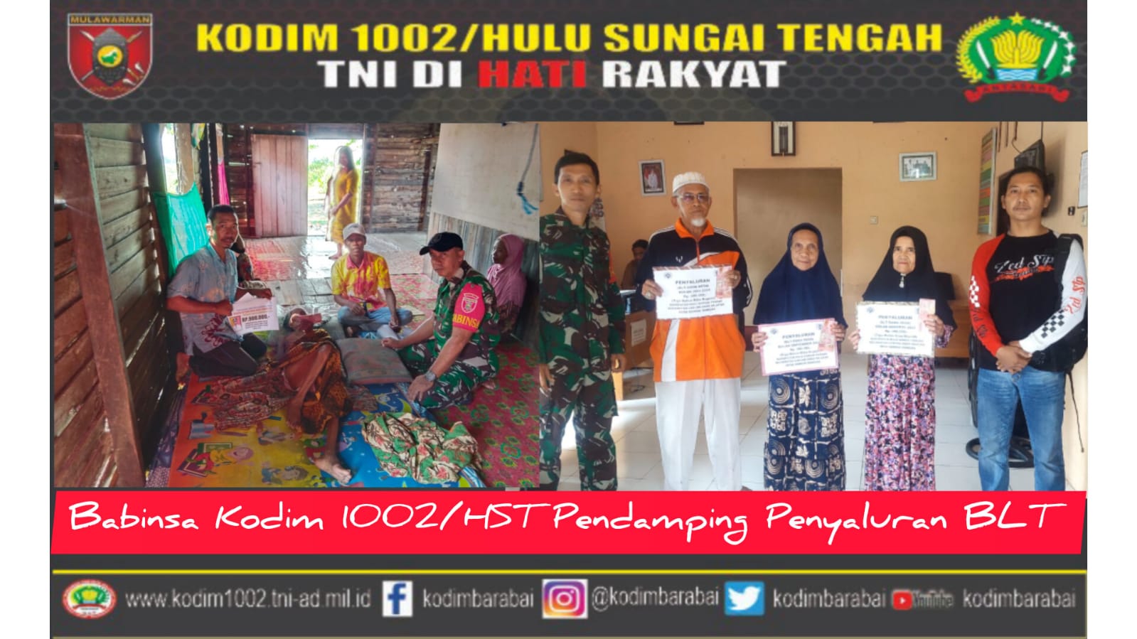 Ditempat terpisah Babinsa Kodim 1002/Hulu Sungai Tengah juga melaksanakan hal yang sama, ini semua dilakukan agar penyaluran Bantuan Langsung Tnuai (BLT) tepat sasaran sehingga bagi warga penerima bantuan yang sudah terdaftar dan tidak hadir karena ada halangan, bantuan tersebut langsung diantar ke rumah penerima bantuan.(pendim1002).
