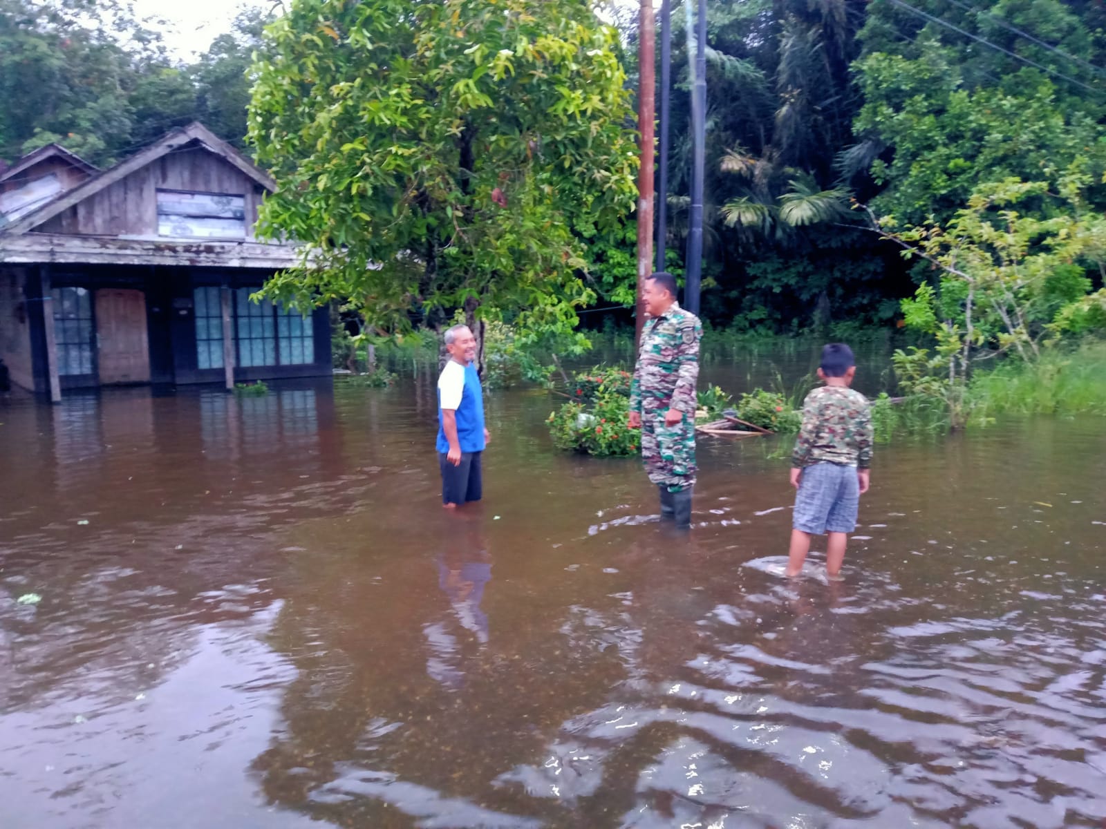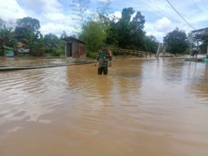 BARABAI-Babinsa Kodim 1002/Hulu Sungai Tengah melaksanakan pemantauan wilayah terdampak banjir.