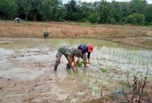 “Dalam rangka menyukseskan ketahanan pangan di masa Pandemi covid-19, Babinsa Kodim 1002/HST Sertu Nasrul Ekoni dari Koramil 1002-07/Batu Benawa melaksanakan pendampingan kepada petani membantu menanam padi. Rabu (24/11/2021).