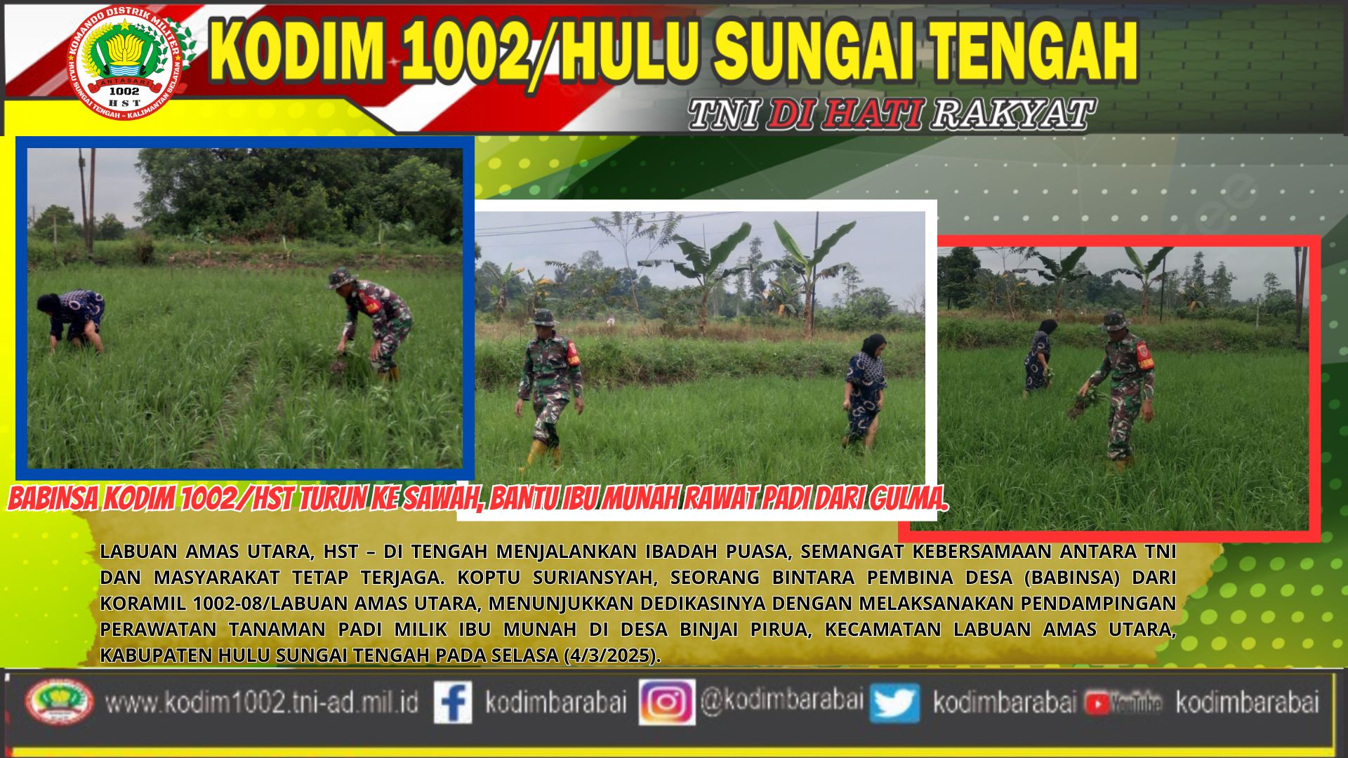 Labuan Amas Utara, HST – Di tengah menjalankan ibadah puasa, semangat kebersamaan antara TNI dan masyarakat tetap terjaga. Koptu Suriansyah, seorang Bintara Pembina Desa (Babinsa) dari Koramil 1002-08/Labuan Amas Utara, menunjukkan dedikasinya dengan melaksanakan pendampingan perawatan tanaman padi milik Ibu Munah di Desa Binjai Pirua, Kecamatan Labuan Amas Utara, Kabupaten Hulu Sungai Tengah pada Selasa (4/3/2025).