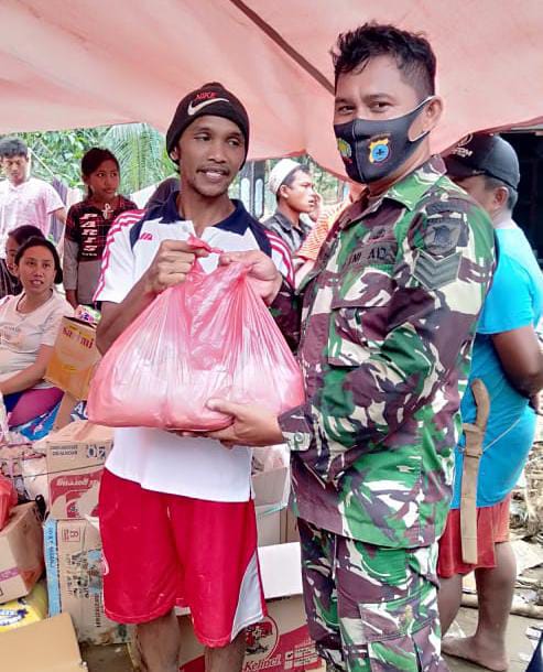 Salah satu Babinsa Kodim 1002/Barabai Serka Aprizal Daitullah anggota Koramil Birayang bersama warga masyarakat Muara Rintis RT.005 RW.002 Kecamatan Batang Alai Utara melakukan penggalangan dapur umum yang diberikan kepada warga korban banjir.