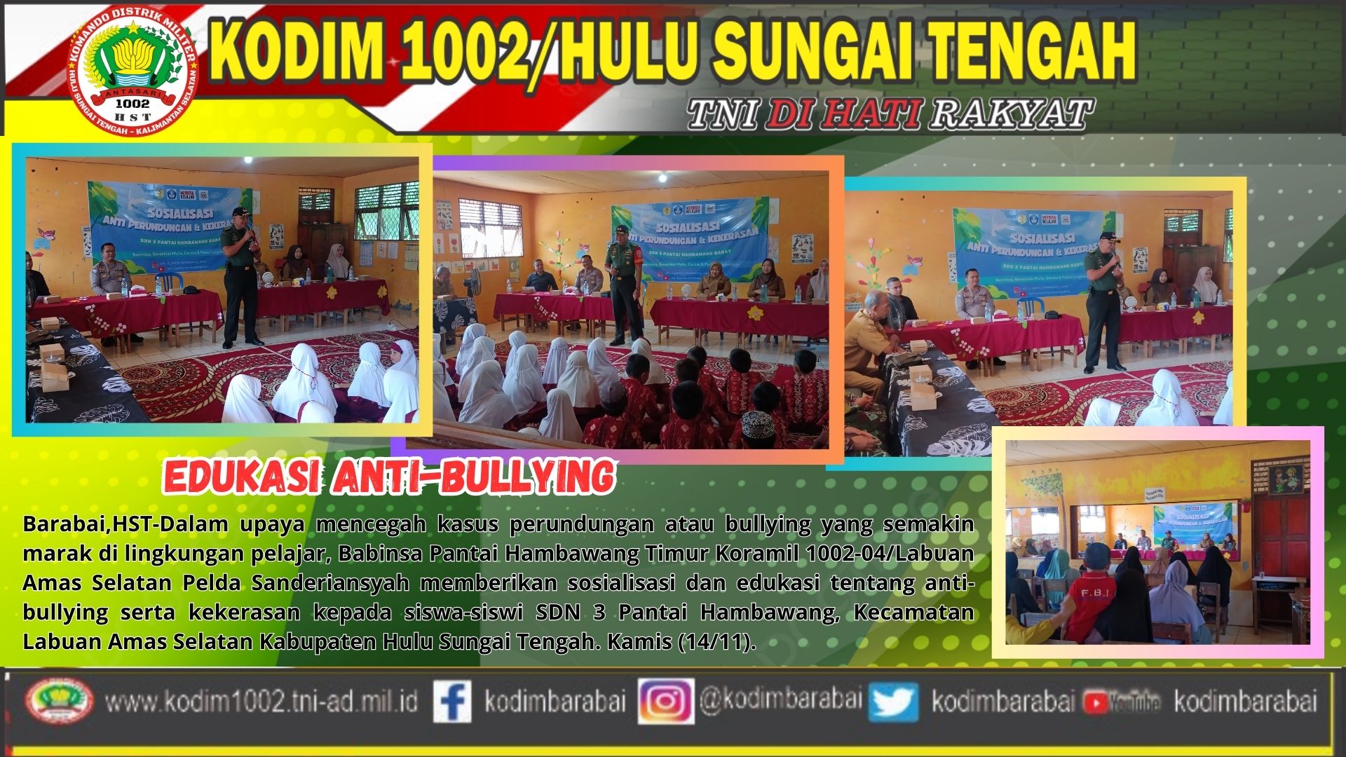 Barabai, HST – Babinsa Pantai Hambawang Timur, Koramil 04/Labuan Amas Selatan, memberikan solusi nyata dalam mengatasi masalah bullying di lingkungan sekolah. Melalui sosialisasi yang intensif kepada siswa SDN 3 Pantai Hambawang, Babinsa tidak hanya memberikan pemahaman tentang dampak buruk bullying, tetapi juga mengajarkan siswa bagaimana cara mencegah dan mengatasi tindakan perundungan.