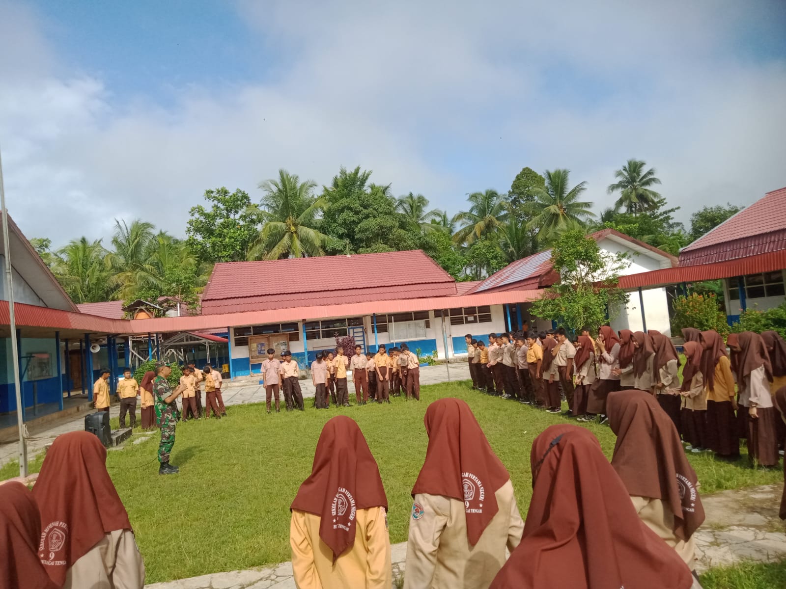 BARABAI-Babinsa Koramil 1002-04/Labuan Amas Selatan Serma Haris Fadilah bersama Koptu Faisol melaksanakan pembinaan wawasan kebangsaan di SMPN 9 Pantai Hambawang. Sabtu (18/03).sore