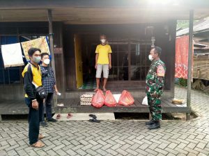 BARABAI-Babinsa Koramil 1002-06/Barabai Serda Slamet Buadi bersama aparat kelurahan Barabai Darat melaksanakan penyaluran bantuan sembako, obat-obatan dan vitamin kepada warga yang sedang menjalani (Isolasi Mandiri) ISOMAN.