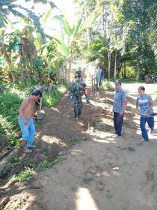 BARABAI-Babinsa Koramil 1002-07/Batu Benawa Serda Embran Hartono bersama warga desa Alat RT.002.RW.003 Kecamatan Hantakan Kabupaten Hulu Sungai Tengah (HST) melaksanakan gotong royong pembuatan jalan desa.Minggu (30/05).