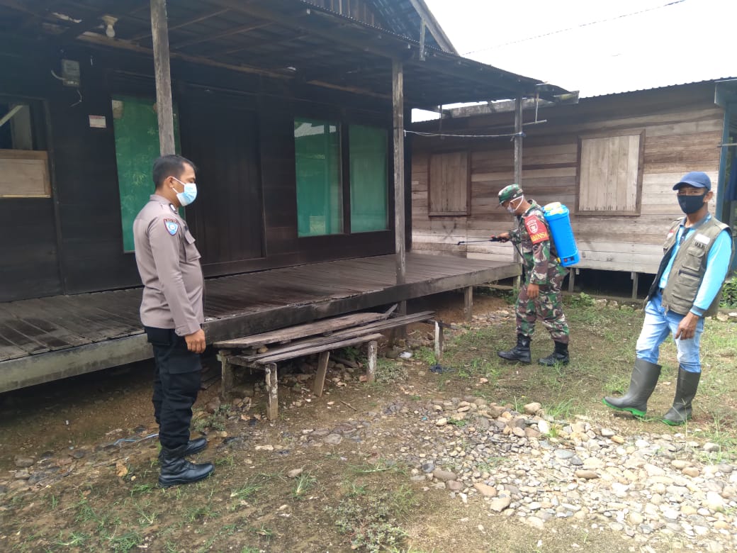 Dalam rangka meminimalisir penyebaran covid-19, Babinsa Koramil 1002-08/Labuan Amas Utara melakukan penyemprotan di lokasi Pra TMMD. Minggu (05/09/2021).