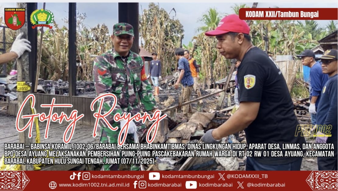 BARABAI – Babinsa Koramil 1002-06/Barabai bersama Bhabinkamtibmas, Dinas Lingkungan Hidup, aparat desa, Linmas, dan anggota BPD Desa Ayuang melaksanakan pembersihan puing-puing pascakebakaran rumah warga di RT 02 RW 01 Desa Ayuang, Kecamatan Barabai, Kabupaten Hulu Sungai Tengah, Jumat (07/11/2025).