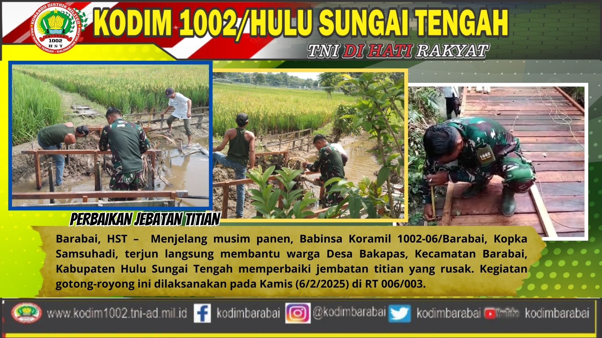 Barabai, Hulu Sungai Tengah – Babinsa Koramil 1002-06/Barabai, Kopka Samsuhadi, bersama warga masyarakat Desa Bakapas, Kecamatan Barabai, Kabupaten Hulu Sungai Tengah, melaksanakan perbaikan jembatan titian di RT 006/003 pada hari Kamis (6/2/2025).
