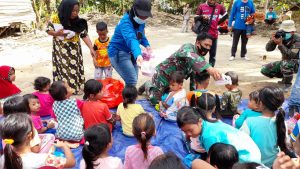 Semoga dengan kegiatan ini, diharapkan warga korban banjir dan tanah longsor bisa ceria kembali untuk menatap masa depan.”tegas Danramil.(pendim1002)