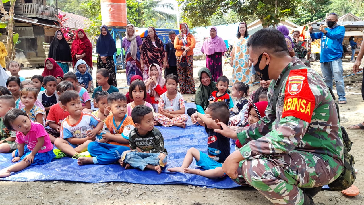 Dalam rangka memulihkan keceriaan dan menghilangkan trauma, Babinsa Koramil 1002-07/Pagat Kodim1002/Barabai Serda Embran Hartono dan Kopka Yusran bersama dinas Perpustakaan dan Kearsipan Provinsi Kalsel menghibur anak-anak korban banjir dan lonngsor di desa Arangani kecamatan Hantakan Kabupaten Hulu Sungai Tengah (HST). Rabu (10/02).