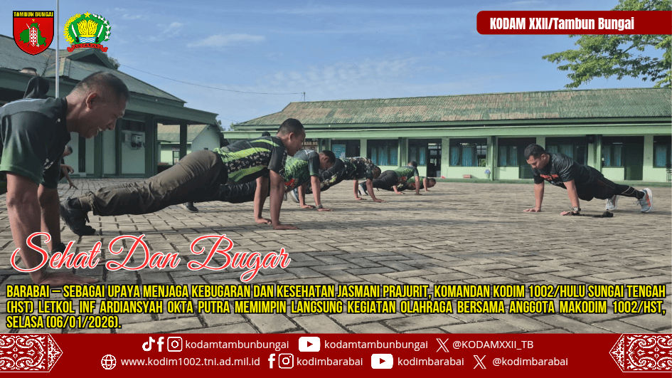 BARABAI – Sebagai upaya menjaga kebugaran dan kesehatan jasmani prajurit, Komandan Kodim 1002/Hulu Sungai Tengah (HST) Letkol Inf Ardiansyah Okta Putra memimpin langsung kegiatan olahraga bersama anggota Makodim 1002/HST, Selasa (06/01/2026).