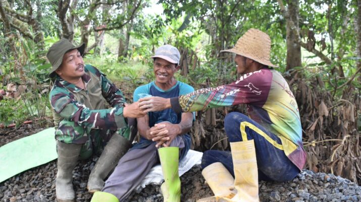 Segelas Disela-sela istirahat bekerja Kopka Yusran berbagi minuman sembari bencanda dengan warga di sasaran pengerjaan badan jalan yang menjadi sasaran utsma fisik dalam Progam TMMD, Minggu (14/05).