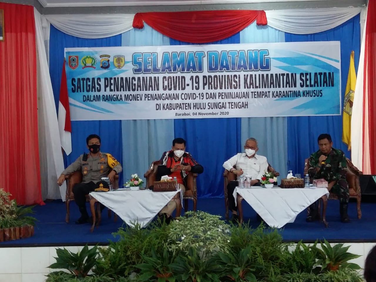 BARABAI-Satgas Penanganan Covid Kalsel dipimpin Plt Gubernur Kalsel H Rudy Resnawan beserta Kapolda Kalsel Irjen Pol Nico Afinta serta Danrem 101/Antasari Brigjen TNI Firmansyah melakukan Monitoring dan evaluasi (Monev) di Kab HST, Rabu (4/11).