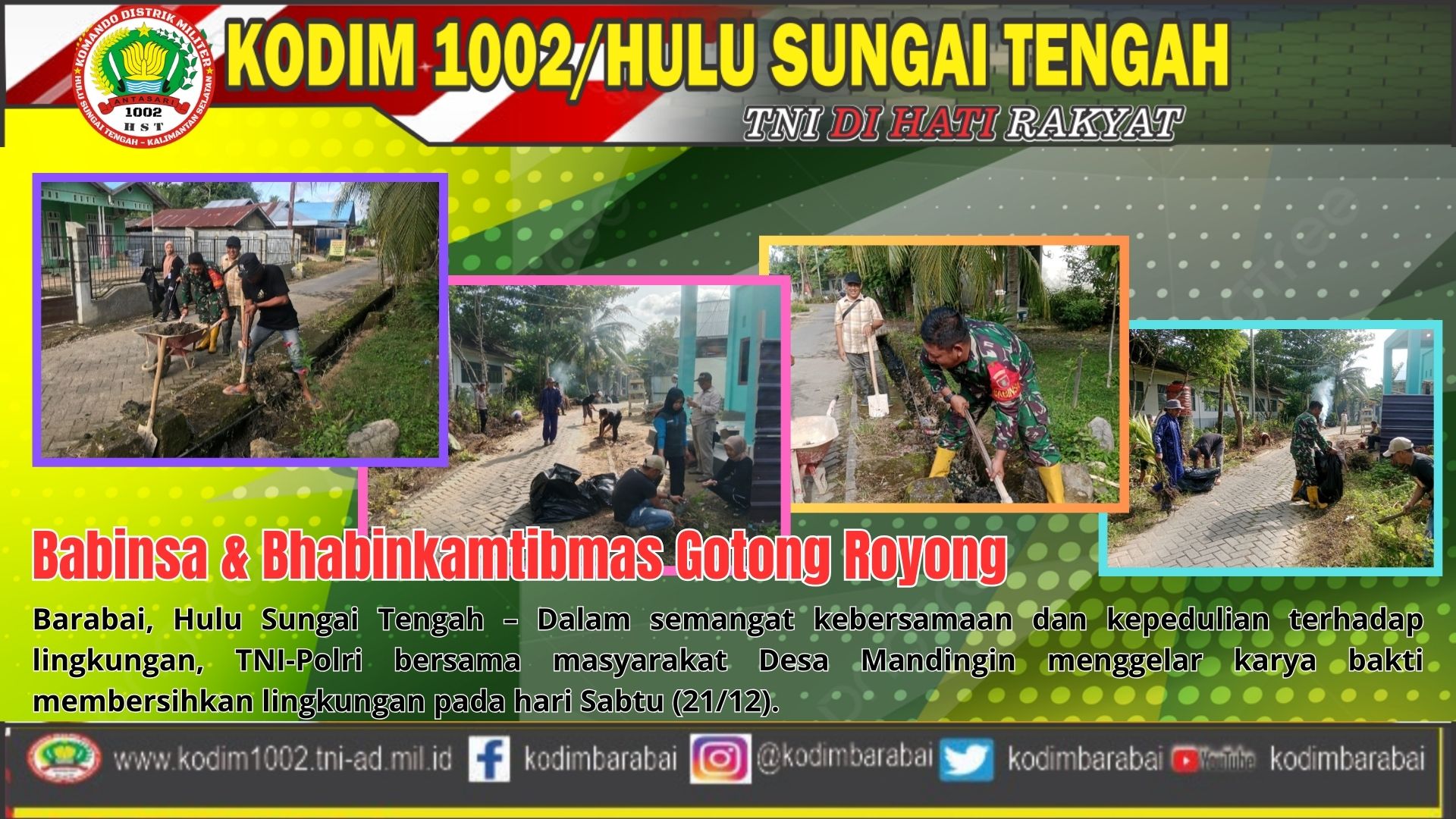 Barabai, Hulu Sungai Tengah – Dalam semangat kebersamaan dan kepedulian terhadap lingkungan, TNI-Polri bersama masyarakat Desa Mandingin menggelar karya bakti membersihkan lingkungan pada hari Sabtu (21/12).