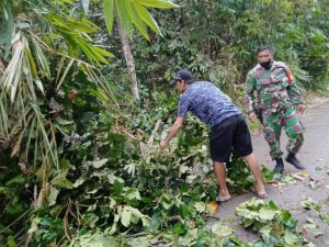 Sesampainya di desa binaan Sertu Rodi Hartono langsung berkoordinasi dengan warga untuk melaksanakan gotong royong evakuasi pohon tumbang.