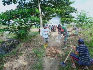 Bersama warga masyarakat Sertu Rusmadi berbaur dan bergotong royong membersihkan jalan sepanjang kurang lebih 1 kilometer dengan lebar 4 meter.