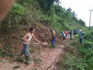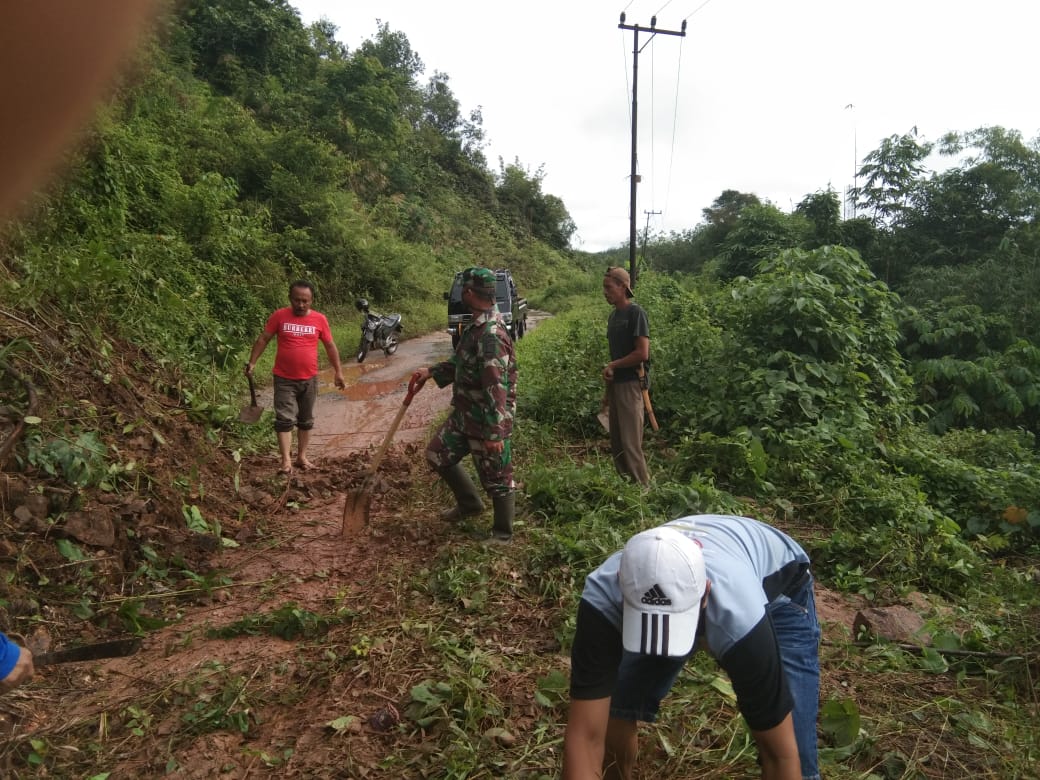 Barabai Kalsel. Babinsa Koramil 1002-07/Pagat Serda Sanu bersama warga masyarakat membersihkan tanah longsor di desa Murung-B Kecamatan Hantakan Kabupaten Hulu Sungai Tengah,Senin, (04/5).