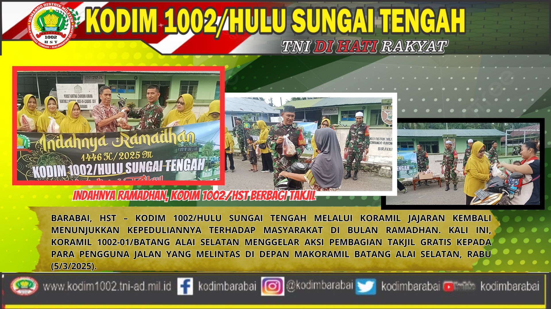Kegiatan pembagian takjil gratis ini merupakan salah satu bentuk nyata kehadiran TNI di tengah masyarakat. Kodim 1002/HST berharap kegiatan ini dapat mempererat hubungan antara TNI dan masyarakat, serta membawa keberkahan di bulan Ramadhan.